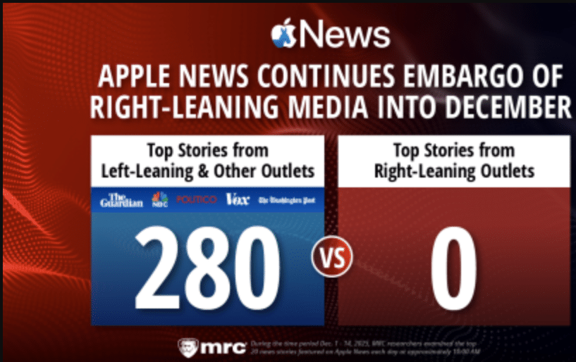 Including reporting from November, MRC researchers have documented 42 days of Apple News stories amounting to 840 total headlines. Of these, only one article was from a right-leaning outlet. The one article was about the Sudanese genocide of Christians and other non-Arabs, a topic the elitist media have largely neglected, and came from British outlet The Telegraph.